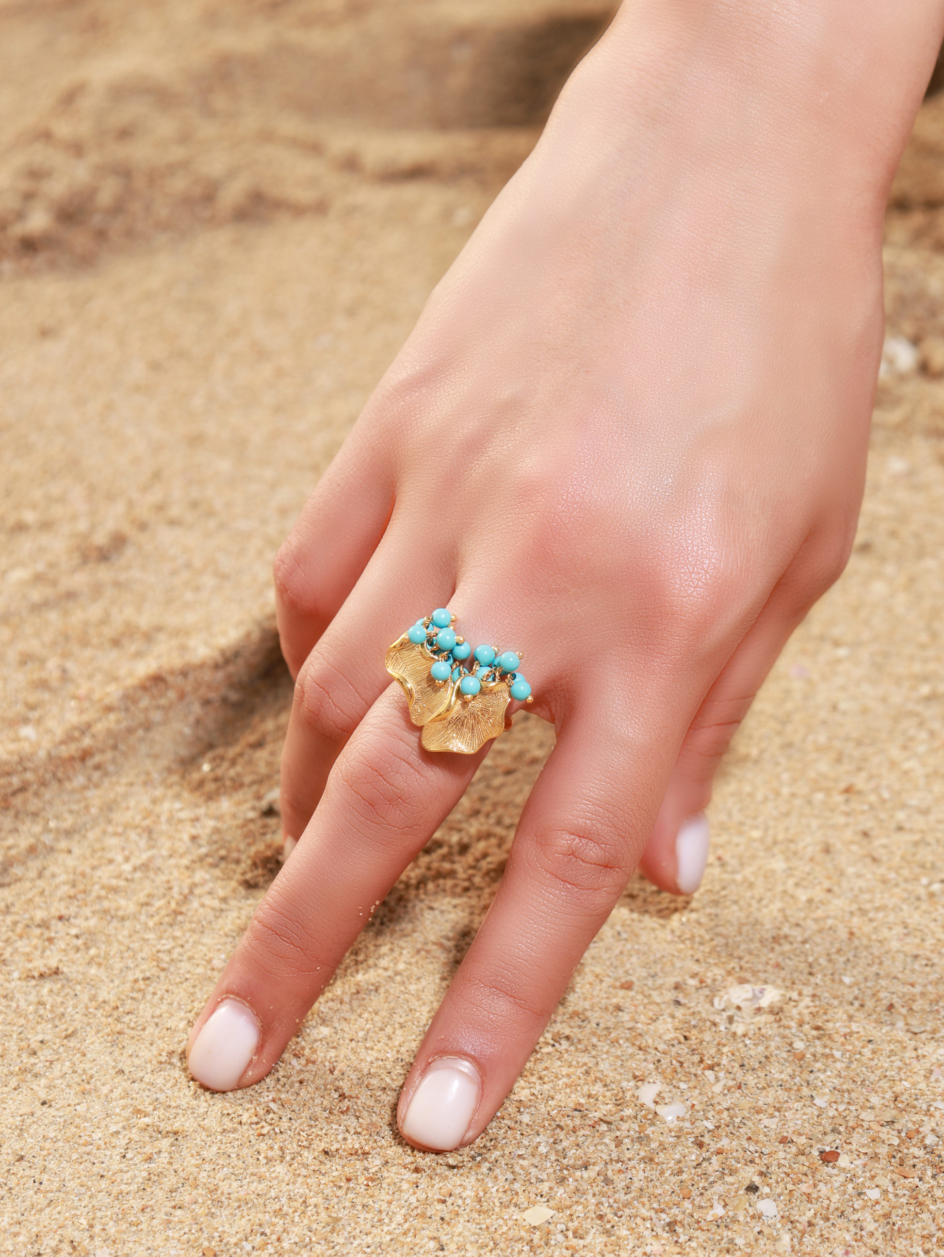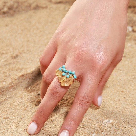 Turath Al-Safa 21K gold ring with turquoise pearls for an elegant, luxurious look.