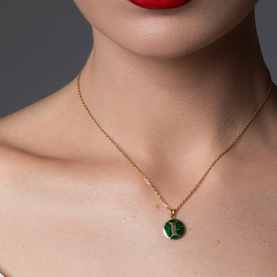 This necklace is made from 18K gold, A zodiac-inspired piece that features the Gemini sign with a luxurious emerald touch.