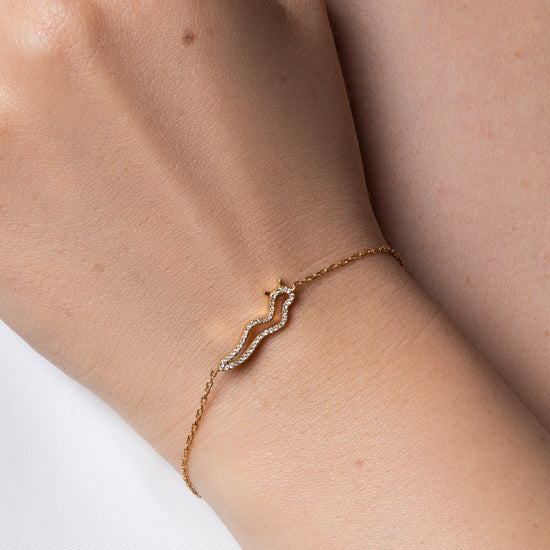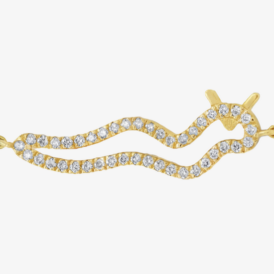 A minimalist 18K gold with diamond charm is woven into a delicate thread bracelet, offering a subtle yet meaningful statement. A sleek and modern bracelet engraved with the ancient hieroglyphic letter F.