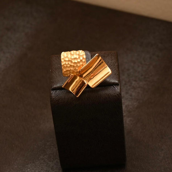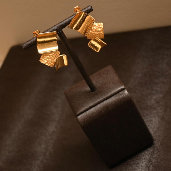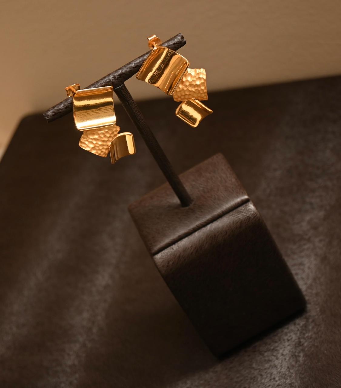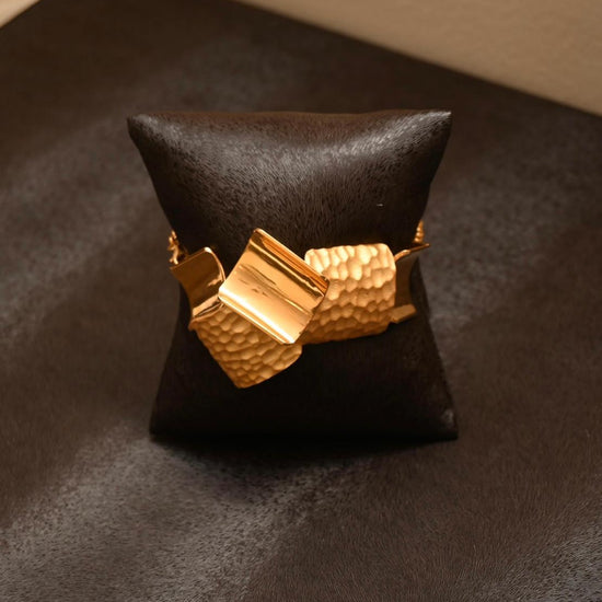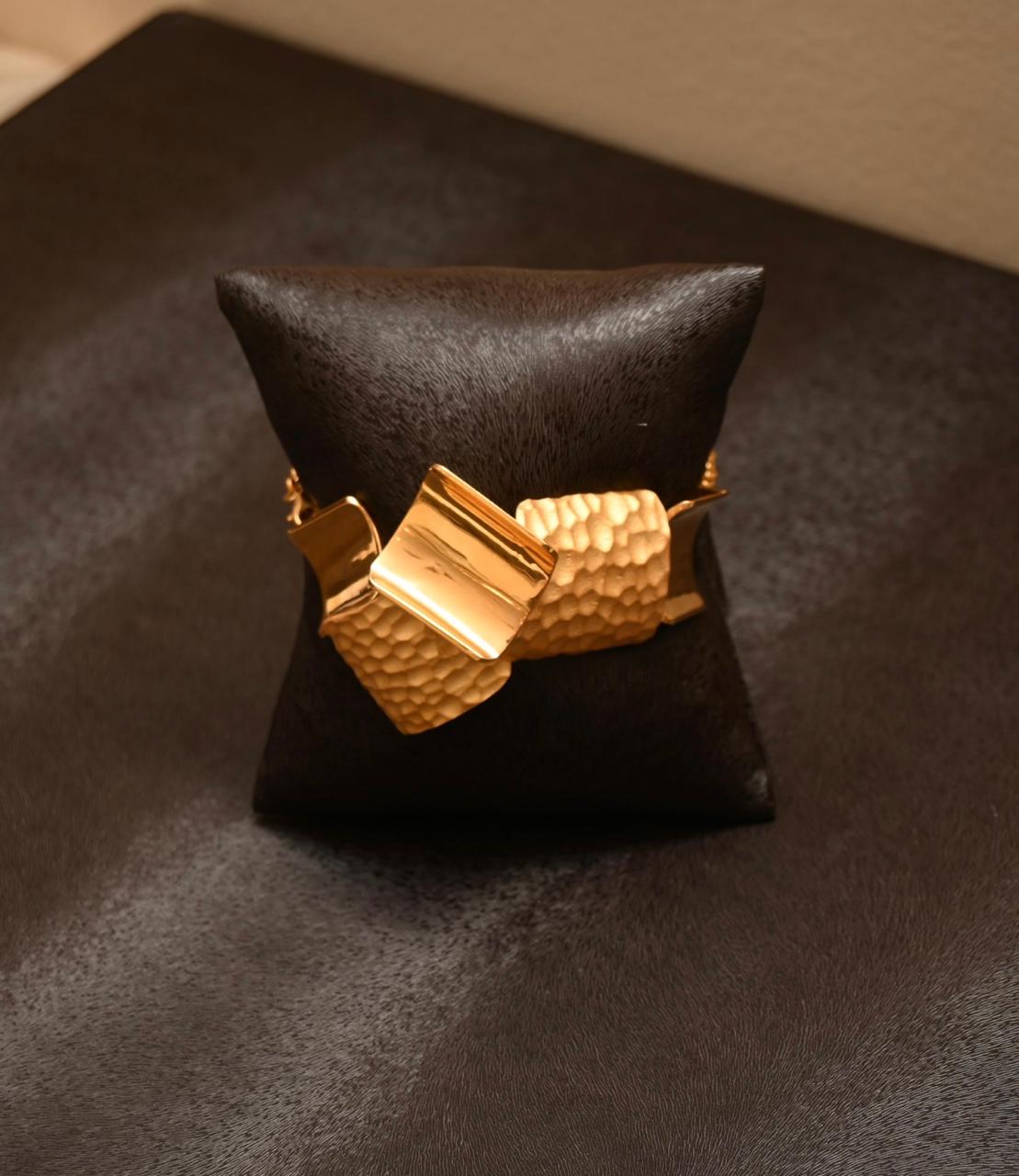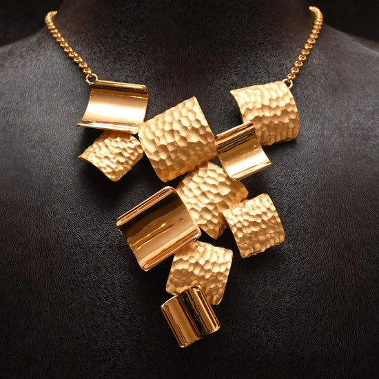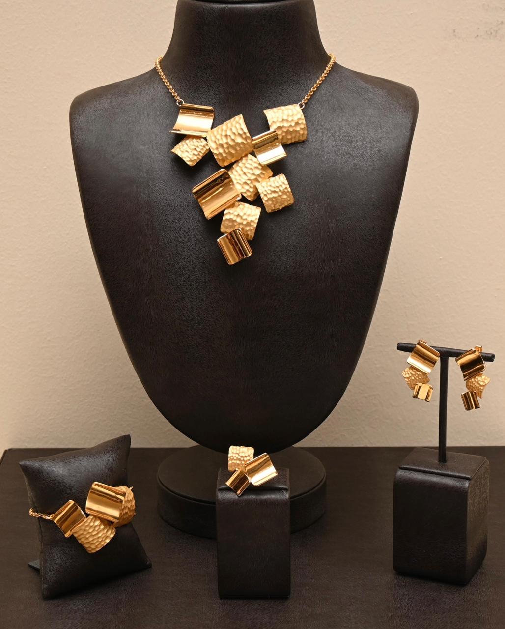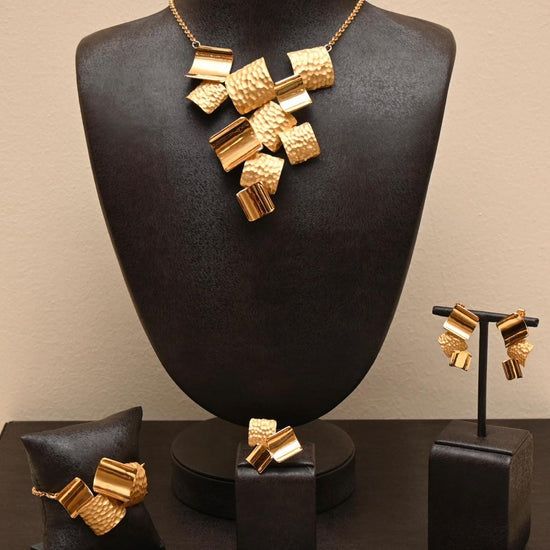 A celebration of movement and texture, this 21K gold set captivates with its cluster of hammered and high-polish segments. The dynamic, sculptural necklace is paired with matching earrings, bracelet, and ring, offering a powerful style statement.