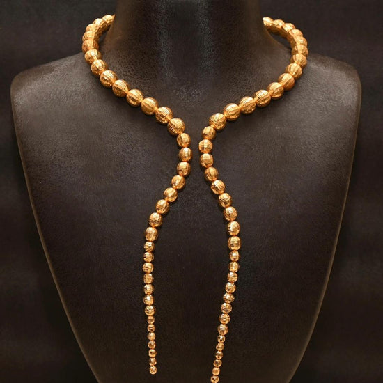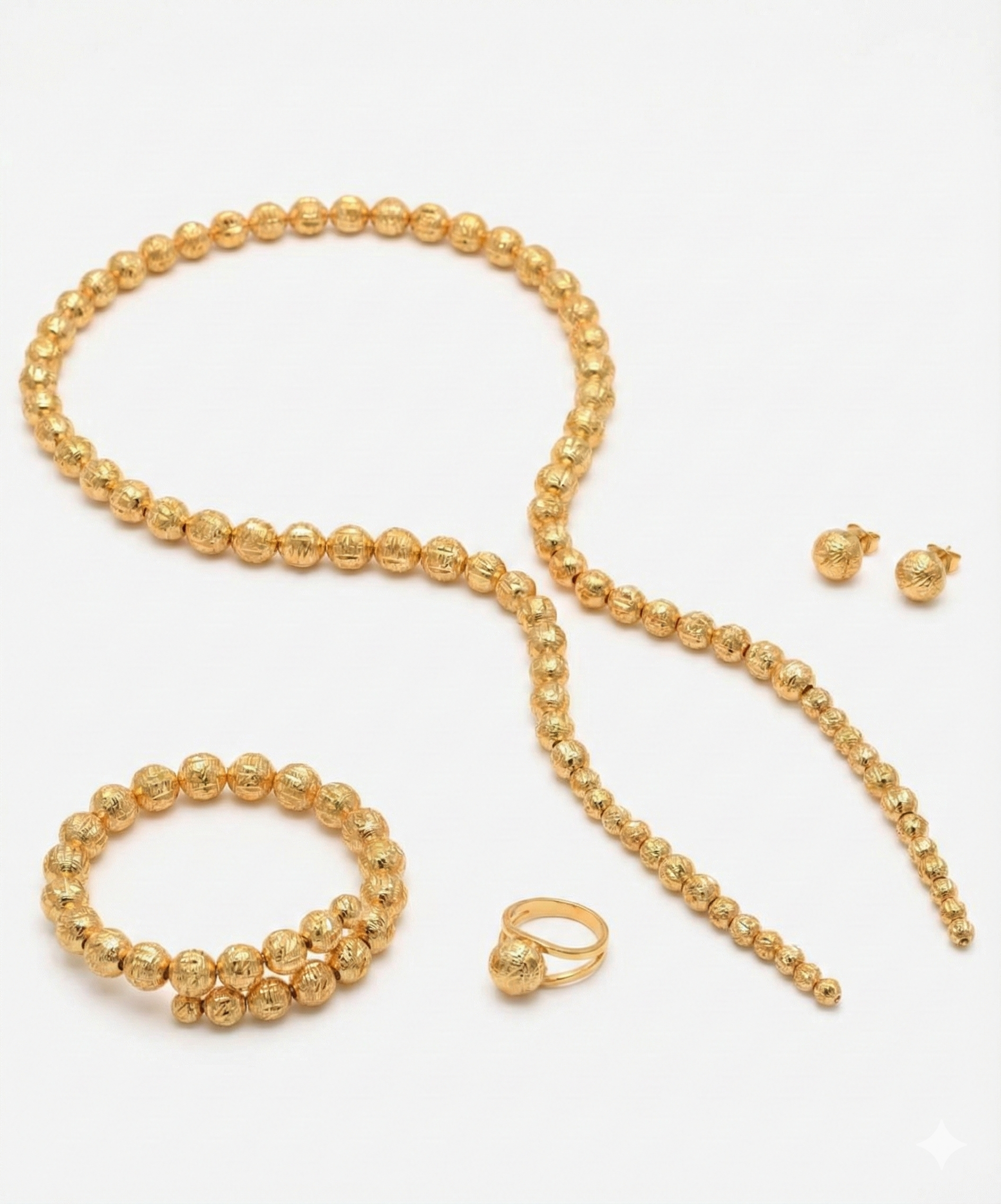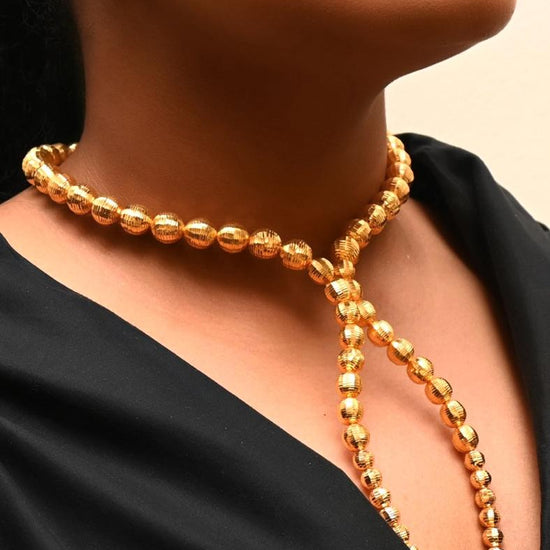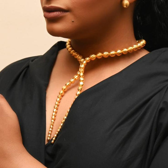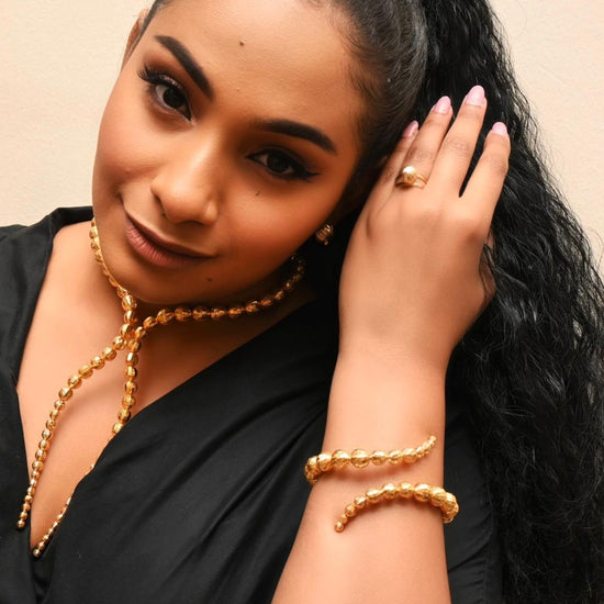 Evoking timeless luxury, this 21K gold set is crafted with high- polish spherical beads arranged into a dramatic lariat necklace. Paired with matching earrings, bracelet, and ring, this set brings a majestic silhouette with fluid movement and refined brilliance.