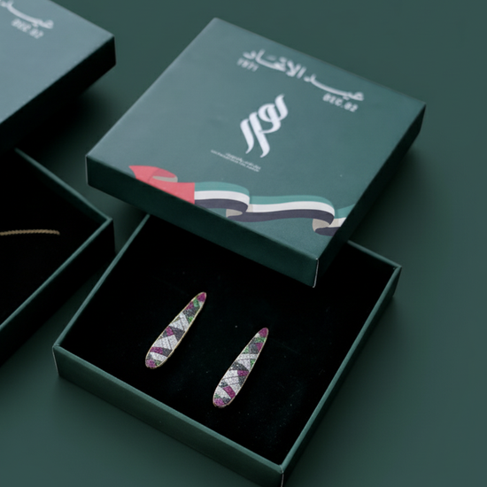 Complementing the Spirit of the Union" collection, these exquisite diamond earrings echo the vibrant colors of the UAE flag. Crafted with dazzling diamonds, they are a perfect blend of elegance and national pride, ideal for celebrating Emirati heritage
